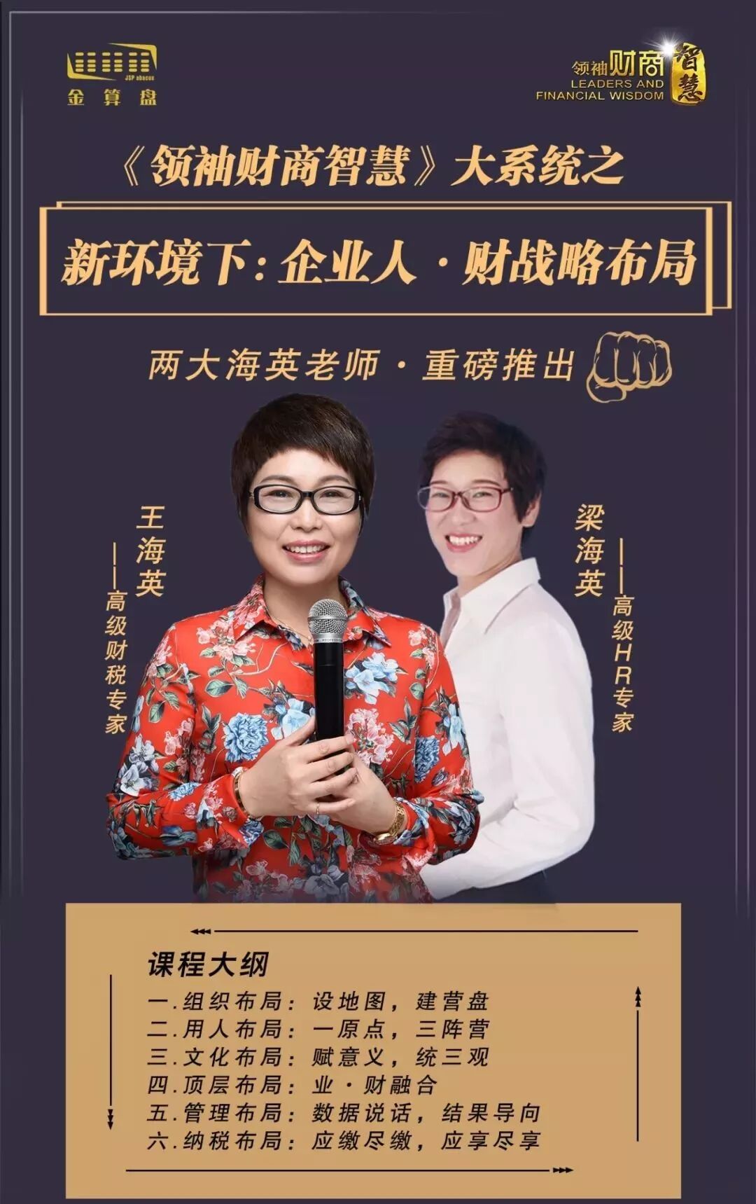 此次课程为期两天,分别由金算盘两位海英老师主讲。浙江金算盘财务管理有限公司董事长王海英,特聘人资专家梁海英权威解读最新优惠政策,剖析财税实务操作中的各项疑难问题,提供财务管理、税务筹划、用人机制赋能的落地系统等解决方案,把企业存在的难点逐一击破,找到企业主心中最完美答案和财商智慧,使企业老板得到一套前所未有的实效、系统、可落地的治企方案。席位有限,报名请趁早!